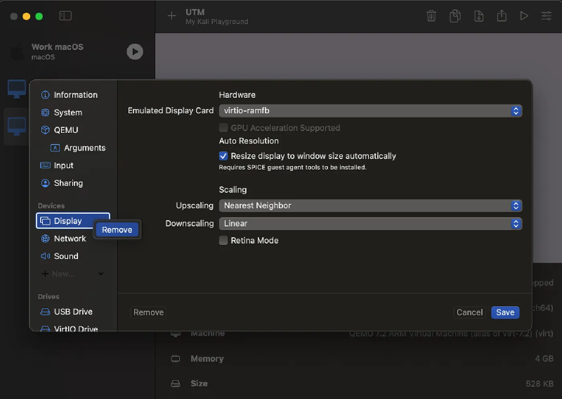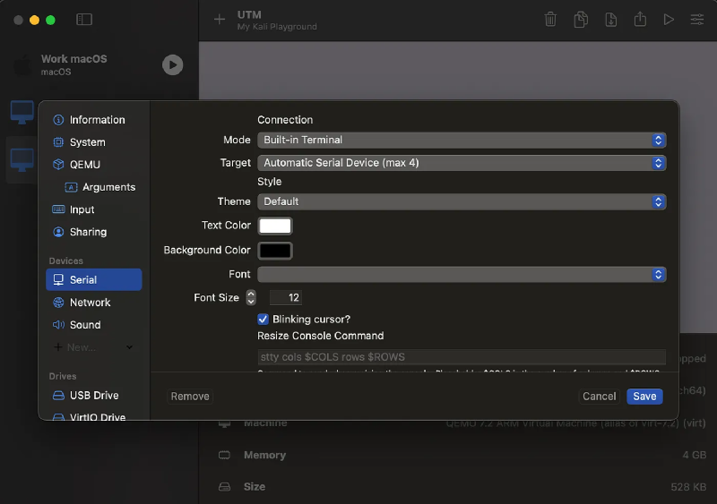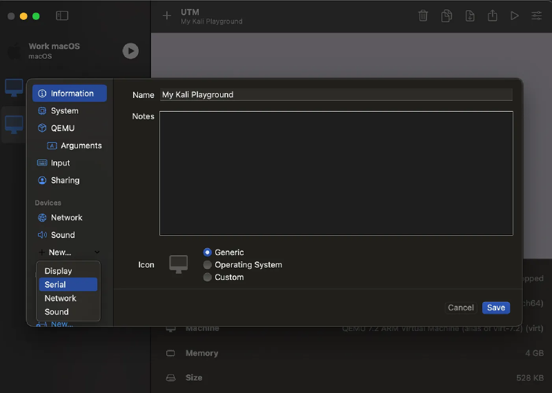 - Due to a bug on UTM, we need to install Kali in console-only mode. Firstly, in the devices list, right click the current Display and select “Remove”. Then select “+ New…” and add a “Serial” device. This will give us a console GUI during the the boot.