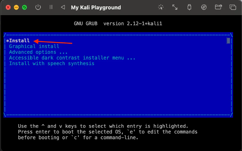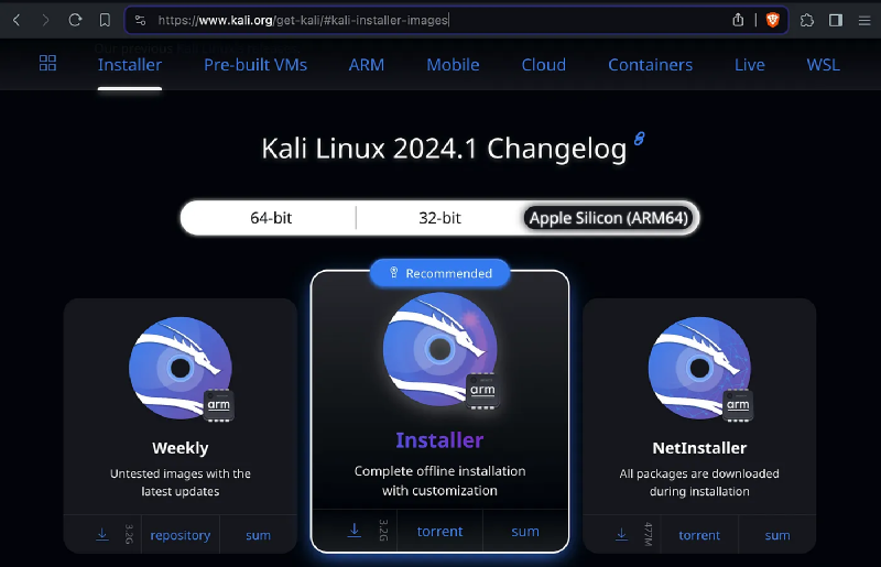 Go to https://www.kali.org/get-kali/#kali-installer-images to download the latest official installer image. Make sure to choose “Apple Silicon (ARM64)”. You can choose offline or online installer image per your needs, but the offline image is recommended for simplicity.