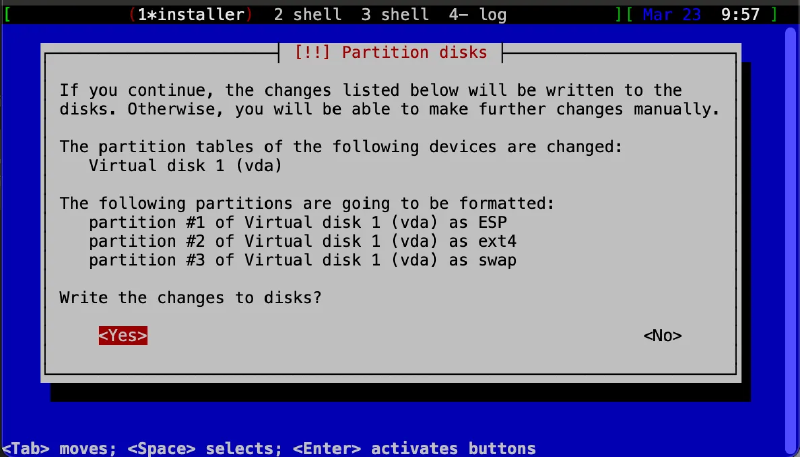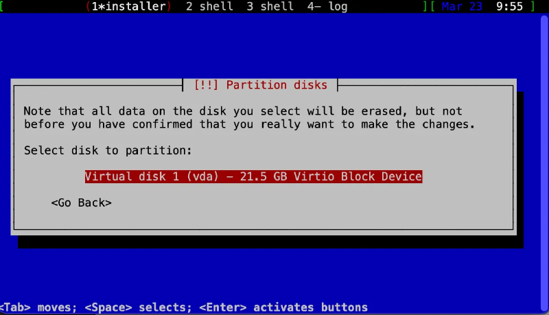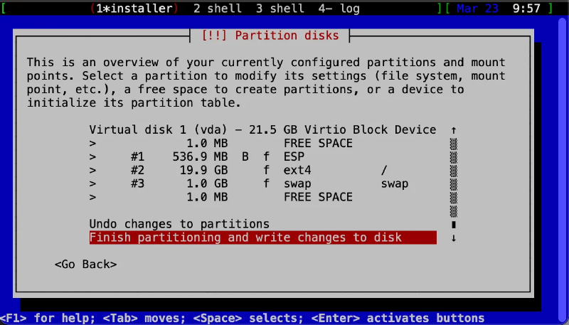 - When you reach the “Partition disks” step, select “Guided — use entire disk” → “Virtual disk 1” → “All files in one partition” → “Finish partitioning and write changes to disk” → “Yes”.