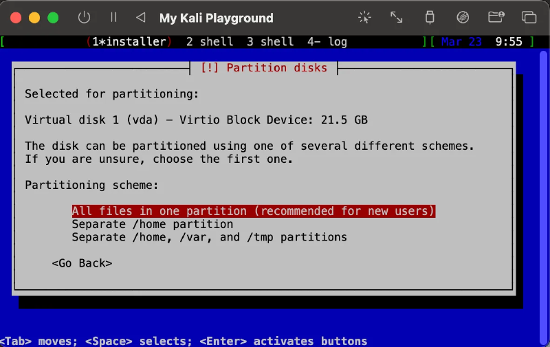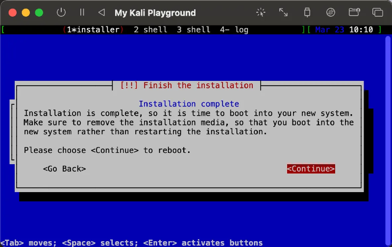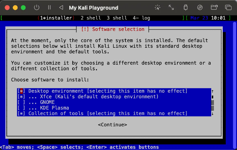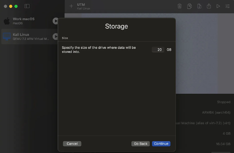 - Decide the disk space for Kali Linux. Kali’s docs recommends ≥ 20GB on the higher end. Then click “Continue”.