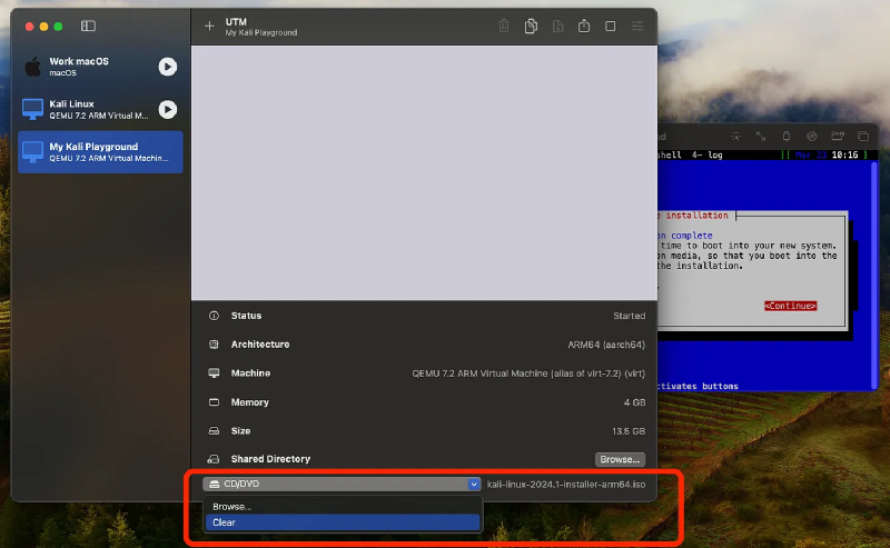 - When you reach the “Finish the Installation” step, DO NOT select “Continue”. Instead, return to UTM’s main window, select your VM on the left, and then scroll down to the bottom on the right side. Select “CD/DVD” and click “Clear”. This action mimics ejecting the installation drive (the