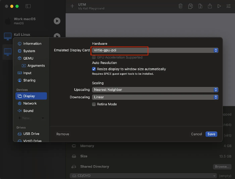 - Edit your VM to remove the “Serial” device. Then, add a new “Display” device, selecting the “virtio-gpu-pci” option. Then save the settings and run the machine.
