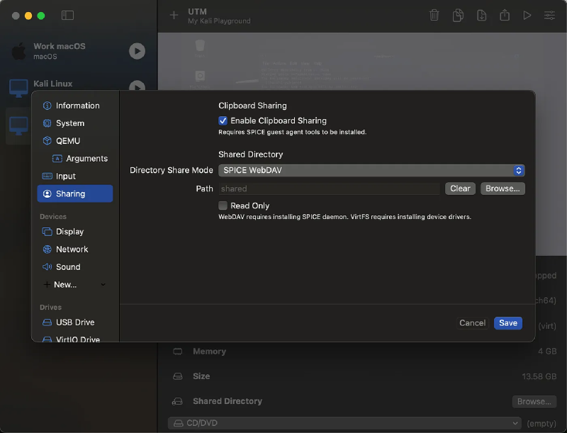 Directory sharing facilitates the sharing of a directory from the host system with the virtual machine (VM). This functionality depends on the Linux package spice-webdavd. Follow the steps below to set it up: Open the Terminal in Kali Linux and run the following command to install spice-webdavd: