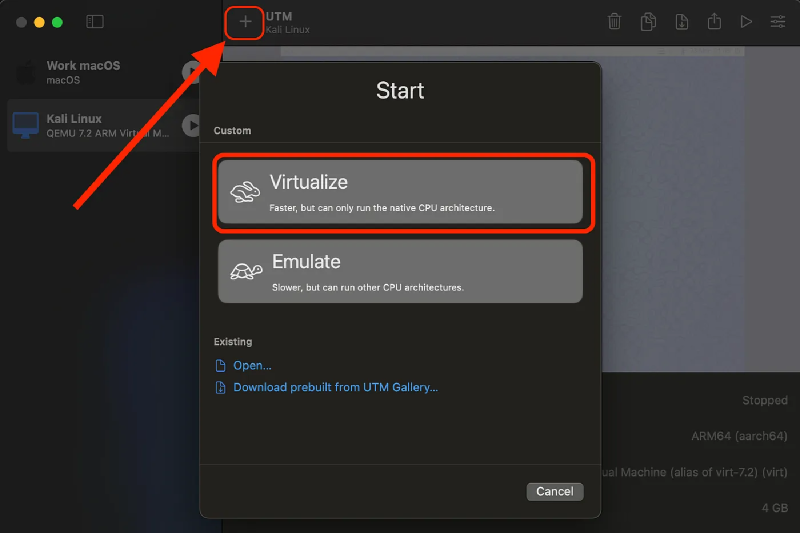 - Open UTM. Click the “+” button to create a new VM. Then select “Virtualize”.