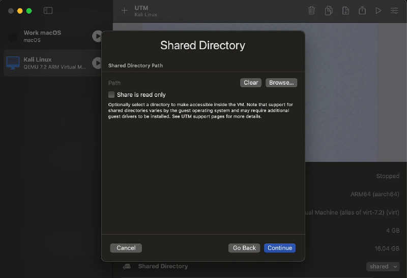 - Set up a shared directory path if needed. This allows sharing files between the host and the virtual client. Let’s skip it for now and click “Continue”.